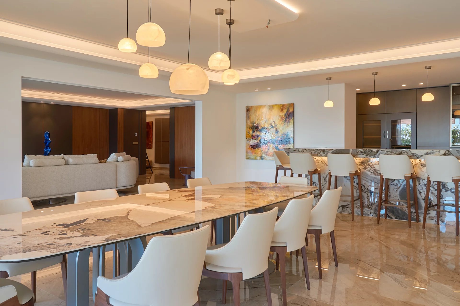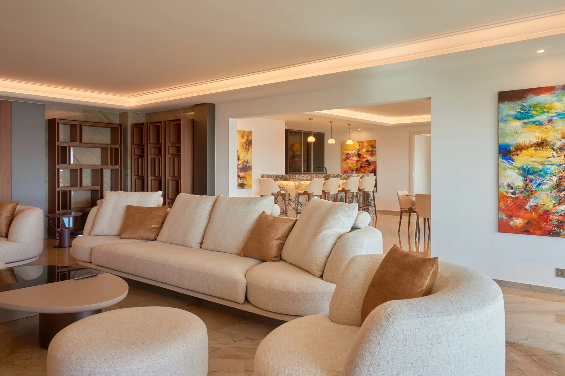 - Réception de plus de 100 m² : salon, salle à manger et espace bar, idéal pour recevoir en grand style